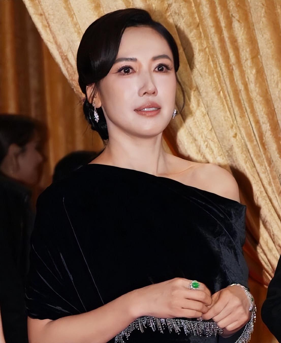 黑色丝绒质地穿在她身上丝毫不显得老气沉闷,反而凸显出优雅沉稳,清透的妆容让她看起来有着出水芙蓉一般恬淡的气质。