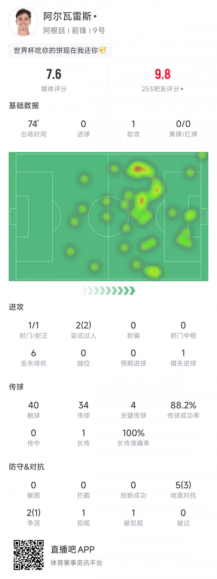 01月 13 2026 0 开云官网-阿尔瓦雷斯全场数据:出战74分钟,1次助攻+4次关键传球 xiaoqiao 2026-01-13 nba 32 9月5日讯 世预赛南美区第17轮,阿根廷对阵委内瑞拉。本场比赛,阿尔瓦雷斯出战74分钟,1次射门1次射正,送出1次助攻,2次过人,错失1粒进球,4次关键传球,传球成功率88.2%,5次地面对抗3次成功,2次争顶1次成功。